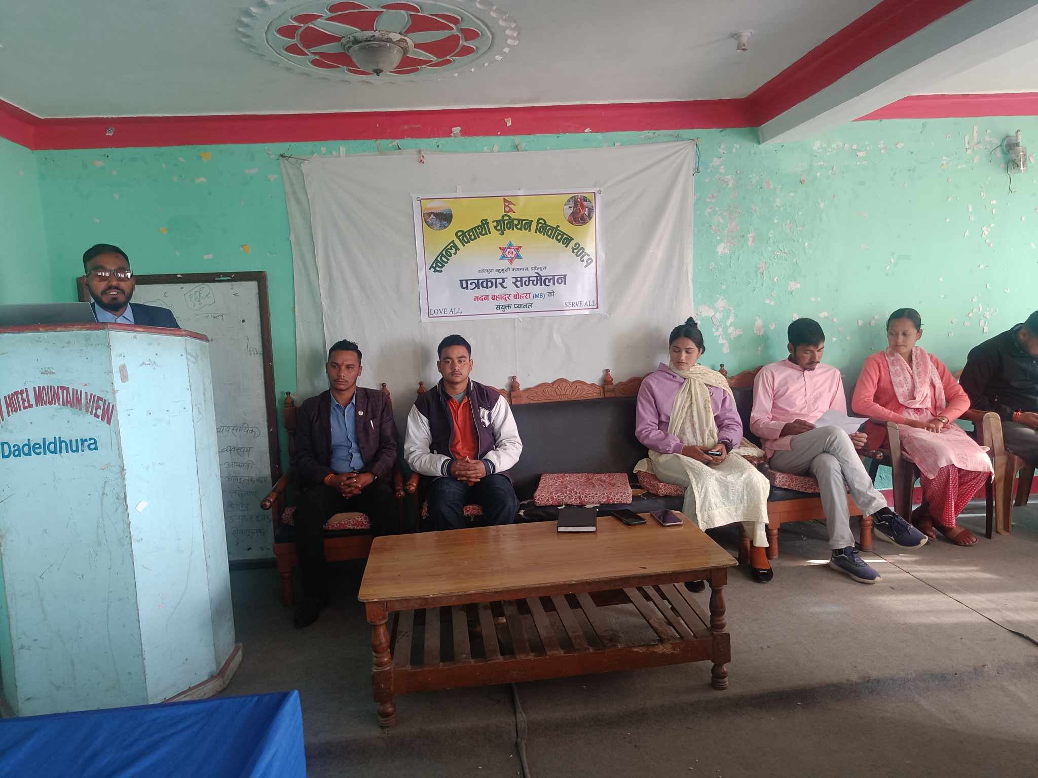 डडेल्धुरा-यहि चैत्र ५ गते हुन लागेको स्वतन्त्र विद्यार्थि युनियनको निर्वाचनमा प्रतिस्पर्धामा रहेको संयुक्त प्यानलले आज पत्रकार सम्मलेन गर्दै आफ्नो धारणा राखेको छ ।