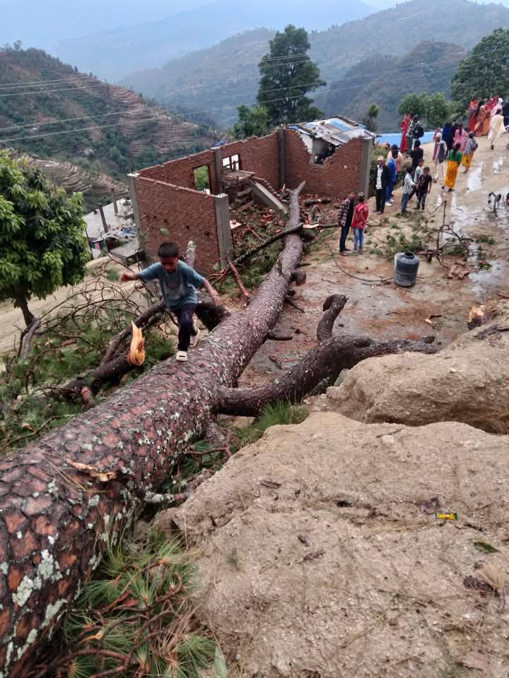 हावाहुरीले सिँगास गाउँपालिका–२ मैतडका विष्णु बोहराको दुईतले जस्तापाताले छाएको घरको छाना उडाएको छ। छाना उडाउँदा जस्तापाताले लागेर घरभित्र रहेका १४ वर्षीय टेकेन्द्र बोहरा घाइते भएको जिल्ला प्रहरी कार्यालयका प्रहरी प्रवक्ता प्रहरी निरीक्षक बलदेव बडूले जानकारी दिए। टेकेन्द्रको टाउकोमा चोट लागेको छ।प्रहरीकाअनुसार सिँगास–५ खैरकोट, सल्याली, ढुङ्गाडका केही घरमा पनि हावाहुरीले क्षति पुगेको छ। पाटन नगरपालिका–८ धारीमा एकतले जस्तापाताले छाएको सामुदायिक भवनको छानो उडाएको छ। उक्त भवनको छानो उडेर नजिकै रहेको विनोद महराको घरबाहिर बाँधेको पाडोलाई लागेर मृत्यु भएको प्रहरी निरीक्षक बडूले बताए। हुरीले रुख ढल्दा डिलाशैनी गाउँपालिका–६ नेगाउस्थित निङ्लासैनी आधारभूत विद्यालयको शौचालयमा क्षति पुगेको छ।