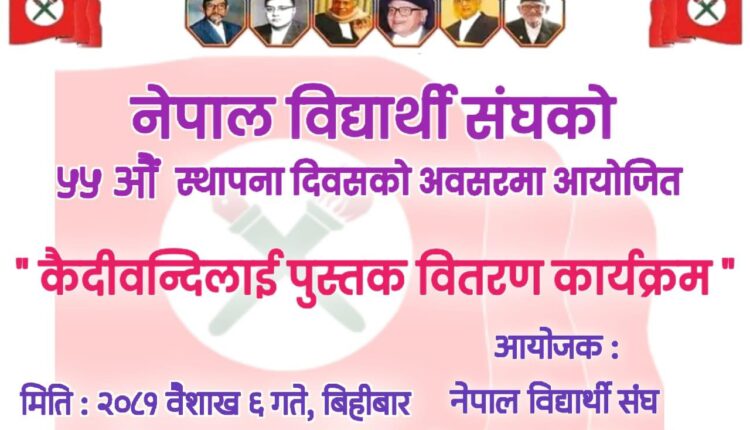 डडेल्धुरा-नेपाल विधार्थी संघ जिल्ला कार्यसमिति डडेल्धुराले ने.वि.संघको ५५औ स्थापना दिवसको अवसरमा डडेल्धुराको कर्तिपुर स्थित डडेल्धुरा कारागारमा रहेका कैदिवन्दिलाई पुस्तक वितरण गरेको छ ।