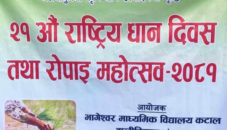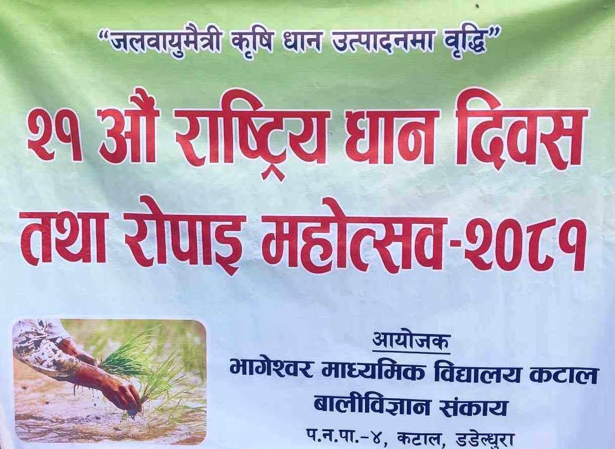 जोगबुडा-डडेल्धुराको परशुराम नगरपालिका वडा नं. ४ कटाल स्थित भागेश्वर माद्यमिक विद्यालयले २१ औं राष्ट्रिय धान दिवस भव्यताका साथ मनाइएको छ । “जलवायु मैत्री कृषि, धान उत्पादनमा बृद्धि” भन्ने मूल नाराका साथ विद्यालयले धान दिवस मनाइएको हो । विद्यालयको प्राबिधिक धारतर्फका शिक्षक विद्यार्थीहरुको सहभागितामा दिवस मनाइएको विद्यालयका प्रधानाध्यापक जनक राज अवस्थीले जानकारी दिए ।