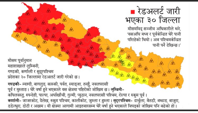 जल तथा मौषम विज्ञान विभाग अन्तर्गतको मौसम पूर्वानुमान महाशाखाले ३० जिल्लामा जोखिमयुक्त क्षेत्रका रूपमा रेडअलर्ट जारी गरेको छ ।
