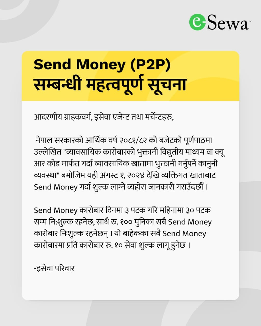 “यही १ अगस्ट २०२४ देखि व्यक्तिगत खाताबाट सेन्ड मनी (Send Money) गर्दा शुल्क लाग्ने व्यहोरा जानकारी गराउँदछौं,” ईसेवाले जारी गरेको सूचनामा लेखिएको छ, “सेन्ड मनी कारोबार दिनमा तीन पटक गरी महिनामा ३० पटकसम्म निःशुल्क रहनेछ । साथै १०० रुपैयाँ मुनिका सबै सेन्ड मनी कारोबार निःशुल्क रहनेछन् ।”
