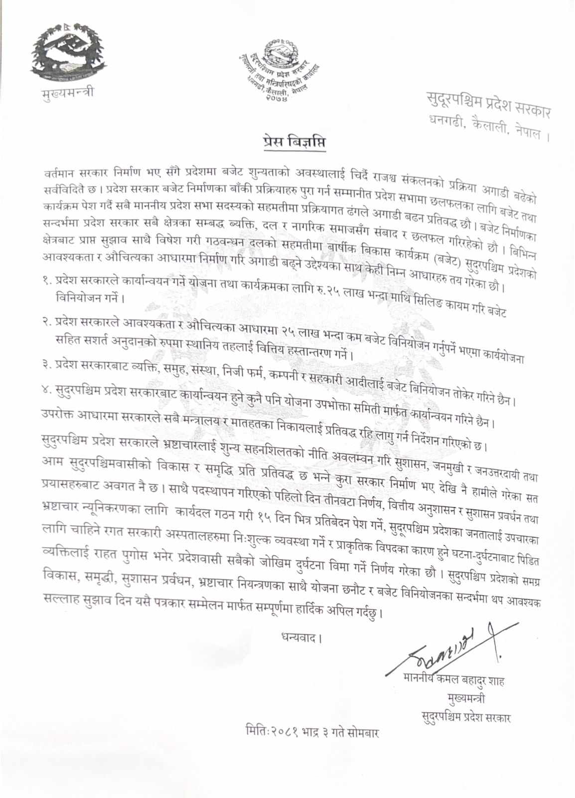 मुख्यमन्त्री कमल बहादुर शाहले सोमबार विहान आफ्नै निवासमा पत्रकार सम्मेलनको आयोजना गर्दै चालु आर्थिक वर्षका लागि तयार भईरहेको बजेटमा २५ लाख भन्दा कम रकमका योजना नराख्ने, प्रदेश सरकारले कार्यान्वयन गर्ने कुनै पनि योजना उपभोक्ता समिति माफर्त नगर्ने बताएका छन ।
