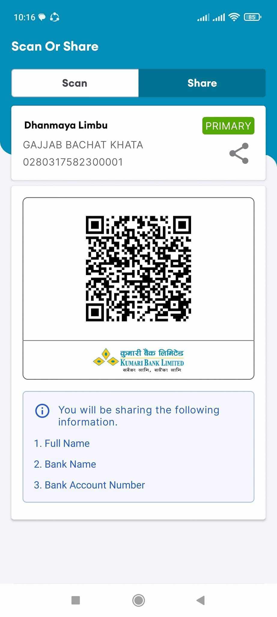 नोटः घाईते नानी बन्दना लिम्बु लाई सहयोग गर्न चाहनु हुन्छ भने कृपया घाईते बन्दनाको आमा को नाममा रहेको बैँक खाताको यो क्यू.आर. कोड प्रयोग गर्न सक्नुहुन्छ ।