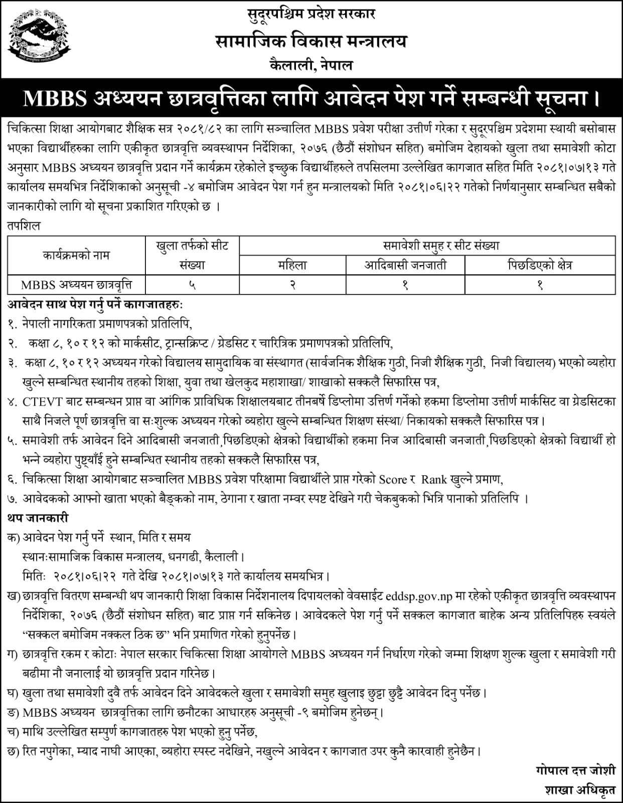 सुदूरपश्चिम प्रदेश सरकार, सामाजिक विकास मन्त्रालयले सार्वजनिक सूचना जारी गर्दै उक्त छात्रवृत्तिका लागि कार्तिकको १३ गते भित्र आवेदन दिन भनेको छ । छात्रवृत्तिमा ५ सिट खुला, २ सिट महिला, १ सिट आदिवासी जनजाति र १ सिट पिछडिएको क्षेत्रका लागि छुट्टाइएको छ । प्रदेश सरकारले २०७६ साल देखि यो कार्यक्रम सञ्चालन गर्दै आएको छ ।