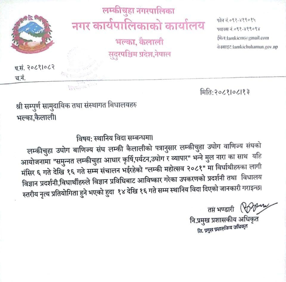 निमित्त प्रमुख प्रशासकीय अधिकृत तप्त भण्डारीले लम्की चुहा उद्योग वाणिज्य सङ्घको पत्रअनुसार स्थानीय बिदा दिएको भन्दै सूचना जारी गरेका हुन् । ‘यही मंसिर ६ देखि १६ गतेसम्म सञ्चालन भइरहेको लम्की महोत्सव २०८१ मा विद्यार्थीहरूका लागि विज्ञान प्रदर्शनी, विद्यार्थीहरूको विज्ञान प्रविधिबाट आविष्कार गरेका उपकरणको प्रदर्शनी तथा विद्यालयस्तरीय नृत्य प्रतियोगिता हुने भएको हुँदा १४ देखि १६ गतेसम्म स्थानीय बिदा दिएको जानकारी गराइन्छ’, नगरपालिकाले जारी गरेको सूचनामा उल्लेख छ ।